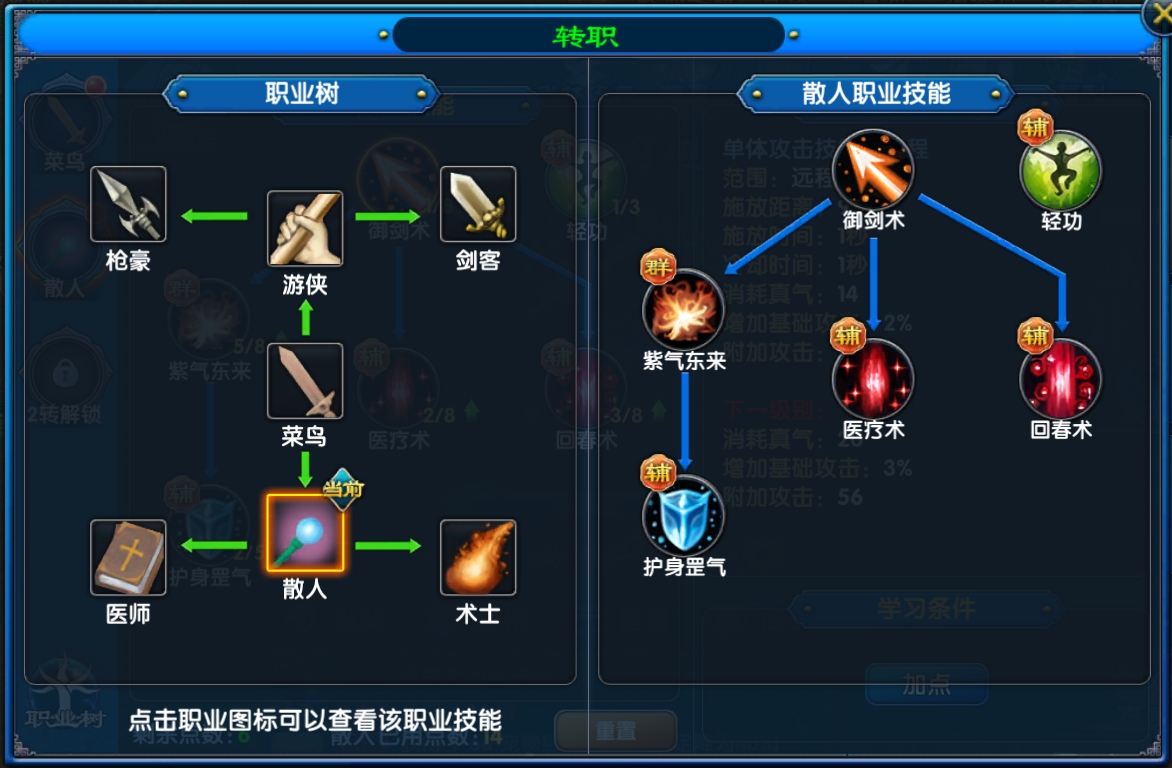 菜鸟&散人从零开始,迈出江湖第一步,所有侠士都将从“菜鸟”职业开始,这一阶段并无明确定位,旨在帮助玩家熟悉游戏节奏与基础操作。 ![]() 从一转开始,大家可以选择更具特色和专业性的职业发展方向,游侠、散人两大分支将开启不同的成长之路。若你未来有意成为“医师”,则必须在此次转职中选择“散人”这一分支。